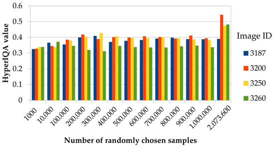 The analysis of the plots presented in Figure 6, Figure 7, Figure 8, Figure 9 and Figure 10 enables an assessment of the stabilization potential of each quality evaluation method, using the bars on the right (obtained for the maximum number of samples, i.e., the reconstructed image without the use of the Monte Carlo method) as a reference point. It is important to note that early stabilization and sensitivity to incremental improvements represent different aspects: HyperIQA reaches stable values early, although they are quite far from the reference ones, whereas the BRISQUE metric reacts more strongly to quality changes during reconstruction. It is also worth noting that the penultimate set of bars represents 1,000,000 samples, i.e., less than a half of the full reconstructed image, resulting in a visible difference between the values of some of the metrics for the last two sets of bars in Figure 6, Figure 7, Figure 8, Figure 9 and Figure 10.
