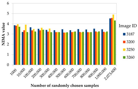 NIMA image quality assessment value for image block size of 6 × 6 pixels and different numbers of chosen samples (reference for 2,073,600 pixels).