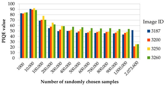 PIQE image quality assessment value for image block size of 6 × 6 pixels and different numbers of chosen samples (reference for 2,073,600 pixels).