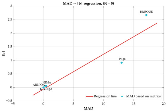 - BRISQUE (Blind/Referenceless Image Spatial Quality Evaluator) [22]—A classical metric based on natural scene statistics (NSS), which analyzes local distortions in the spatial domain; it employs a linear regression model to predict image quality based on statistical features extracted from the image; it is fast and reliable for traditional types of distortions.