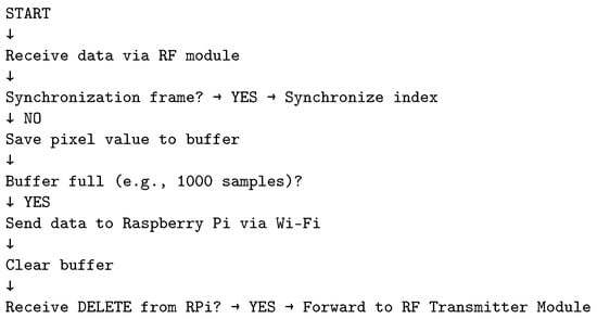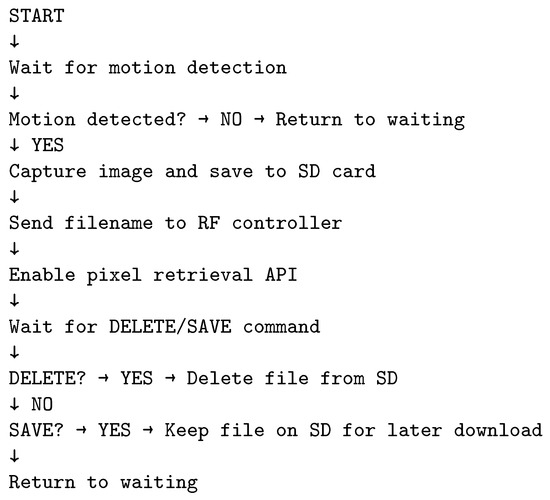 However, certain system tasks exhibit lower requirements in terms of responsiveness and computational power. Within the proposed ecosystem, this includes a camera module and transmission modules integrated with a microcontroller. Our focus is placed on the widely adopted Arduino software platform (ver. 1.8.19 for Linux), which facilitates the rapid deployment of technical projects, thereby reducing the cost of application development and testing. This process is further supported by the use of sketches—predefined code snippets readily adaptable for integration into custom applications.