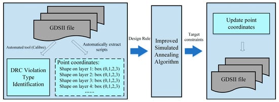 The standard cell library serves as an important bridge for digital integrated circuits, and the layout design in its construction process is regarded as the most complex and time-consuming task [1,2,3,4,5,6]. This is mainly because the layout design has to adhere to extremely complex design rules, which are interdependent and interrelated [7,8,9,10]. Currently, the majority of existing technological solutions make attempts to address the DRC violation problem in standard cell layouts by employing more traditional methods. For instance, in some solutions, engineers are relied on to systematically check for violations in the layout and make manual adjustments based on their own experience. This approach is labor-intensive and prone to omissions for large-scale layouts [11,12,13,14]. There have also been some early automation attempts [13,14,15,16]. Although certain violations can be detected by these attempts, during the repair process, comprehensive consideration of complex layout structures and diverse design rules is lacking. As a result, new violations are introduced in the repaired layout, or the performance of other originally compliant areas is affected.