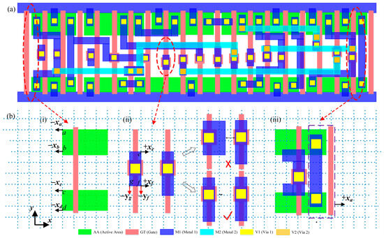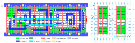 A schematic diagram of the standard cell layout of a 14 nm process in a certain foundry (taking the D flip—flop as an example) is shown in Figure 4, where the layout with DRC violations is presented in Figure 4a, and the schematic diagram of DRC repair is shown in Figure 4b. Compared with the MOSFET process, the FinFET process has more requirements for the definition of Fin and the design of its AA region width. However, other key DRC violation indicators are the same as those of the MOSFET, and the repair process is also identical, so they will not be described again. In the standard cell layout design of the FinFET process, violations are often caused by too small Fin spacing, which simultaneously results in the width of the AA not being met. Therefore, the proposed method will increase the spacing of the fins (moving in the negative direction of the Y-axis) according to the design rule (DFin = 0.038 µm), and then the width of the AA will also increase. Eventually, the extra Fin due to the increased spacing will be deleted.