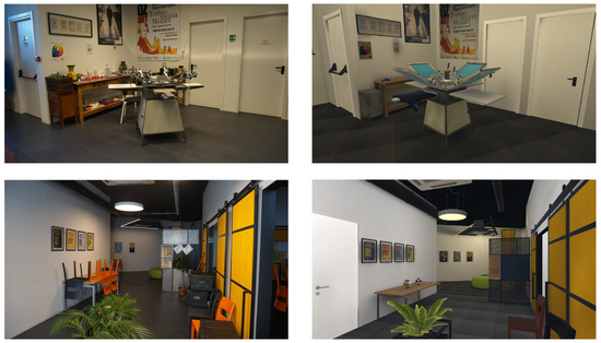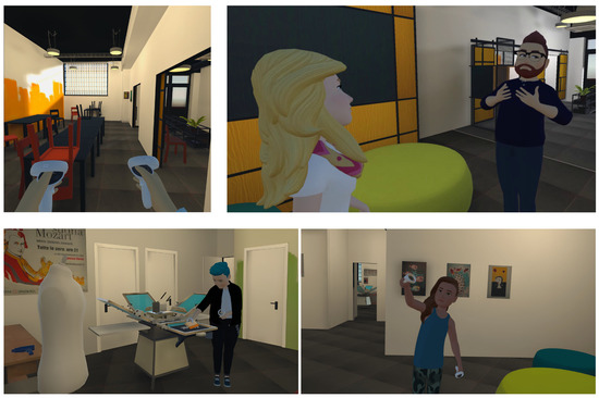 Our approach presents two main key points that, to the best of our knowledge, represent a novelty. (i) The digital twin represents the specific center and not a generic DAC. This way, users already know where the kitchen will be and where to go for a snack, or where they will find the restroom. The system also includes a set of interactive activities that are available in the specific center, such as playing table football or printing graphics on t-shirts using a screen-printing machine. This allows users to virtually explore the center and become familiar with the environment before visiting in person. (ii) The multiplayer sessions allow users to enter the virtual center together with their personal caregiver, the same way it will happen in person. The user is guided through the virtual visit by an avatar embodied by the participant’s actual caregiver, introducing a familiar and trusted presence, which may enhance engagement and reduce stress during the session. Throughout the session, the two can freely navigate the virtual environment, talk to each other, see each other’s avatar and share the virtual space, allowing the caregiver to tailor the experience to the participant’s needs.