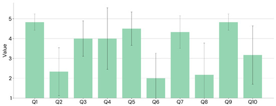As mentioned, responses were provided on a Likert scale from 1 to 5, where 1 corresponds to “Very Little” and 5 to “Very Much”. The total score, calculated as the sum of individual responses, ranged from 6 to 30, with question 4 representing a negative effect and being treated accordingly. Overall, the questionnaire results align with our observations: mean values indicate that participants generally felt comfortable and safe within the simulation (see