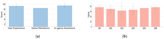 In the main study with six adult participants diagnosed with ASD at DSM-5 Level 1 (all male; 18–50 years), both standardized questionnaires and observational data converged in supporting these hypotheses. The SUS total score (mean ) exceeded the acceptability benchmark and was statistically significant (one-sample Wilcoxon signed-rank test vs. 50: , ), indicating good usability of the system for the target population (H1). The adapted VRNQ total score (mean ) was also significantly above the rescaled acceptability threshold (one-sample Wilcoxon signed-rank test vs. : , ), supporting suitability (H2). Beyond total scores, subscales help interpret which experience factors worked well. Participants reported high enjoyment and perceived technology quality (User Experience subscale total = ), solid ease of navigation and manipulation (Game Mechanics total = ), and particularly strong ratings for guidance and onboarding (In-Game Assistance total = ), suggesting that tutorials and caregiver-supported scaffolding effectively lowered the entry barrier to the experience. Participants’ feedback on the Avatar Guide questionnaire suggested that the presence of the caregiver, embodied in a virtual avatar, contributed to the overall enjoyment of the VR experience and provided meaningful support to participants (mean ), significantly greater than the threshold (one-sample Wilcoxon signed-rank test vs. 10.5: , ), supporting H3. All three tests remained significant after Benjamini–Hochberg correction, indicating that results retain statistical significance despite the limited sample while controlling the expected proportion of false positives. It is worth noting that the primary goal of the present study is system validation rather than inferential hypothesis testing; therefore, despite the small sample size, the statistical analysis supports immediate observations from user interaction rather than broad generalizations. Observationally, all participants displayed engagement and curiosity, transitioning from caregiver-prompted actions to increasingly autonomous exploration of the digital twin. This behavioral pattern towards adaptation aligns with the intent of the experiential training approach, and further supports H3. While one participant wore the headset only briefly, the group as a whole showed motivated exploration and interest in interacting with the modeled activities, such as those mirroring real objects and routines in the center.