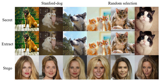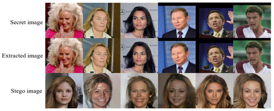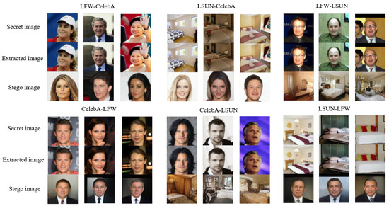 Figure 6 show secret images and generated stego images, in different domains. For example, the LFW-CelebA signifies that the secret image is randomly selected from the LFW dataset, and the generated stego image is similar to the style of the CelebA dataset. From