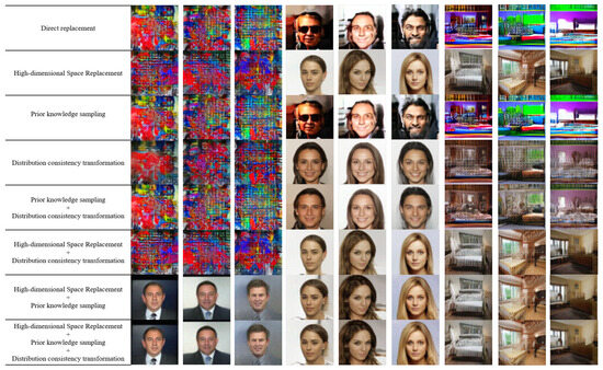 Figure 10 performs an ablation analysis of three tactics employed by DF-SWE, which are prior knowledge sampling, high-dimensional space replacement, and distribution consistency transformation. The first three, middle three, and last three columns of images are the effect of different tactics on the LFW, CelebA, and LSUN datasets, respectively.