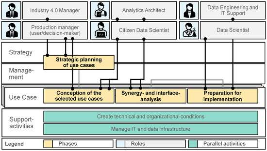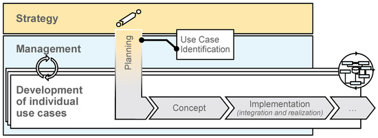 Industry 4.0 use case development initiatives often fail due to a lack of connection between the strategic, tactical, and operational levels [39] (p. 974). From a methodological perspective, development process models usually focus either on a use-case-specific perspective (e.g., [40]) or the overarching strategic context. At the core, the development of analytics use cases should align with the overall strategy (e.g., [41,42]). An overview of the phases in the development of analytics use cases can be found in Figure 1.