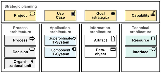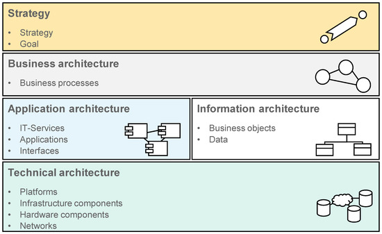 - Matthes, D. Enterprise Architecture Frameworks Kompendium; Springer: Berlin/Heidelberg, Germany, 2011; ISBN 978-3-642-12954-4. [Google Scholar]