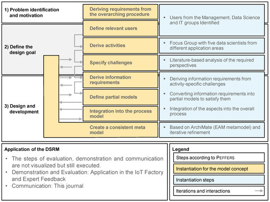 The approach for developing the modeling concept is illustrated in Figure 3, which presents the created design goals, artifacts, and additional descriptions. It is based on the development of design frameworks according to ISO/IEC/IEEE 42010:2022 and the DSRM approach according to Peffers et al. [93,96]. Details regarding each step are provided in the following chapter. For the evaluation, the resulting framework is demonstrated and discussed in light of the raised design requirements.