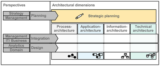 The four phases of the overarching process must be supported by relevant perspectives. As described in the process model, particular emphasis is placed on supporting the phases of planning, integration, and design. An overview of the underlying perspectives corresponding to the phases is shown in Figure 6. These perspectives aggregate the necessary information to address the challenges and needs of the activities in the overarching process model. The relevant perspectives are based on the EAM dimensions according to Bitkom and Lankhorst [60] (p. 44), [67] (p. 13).