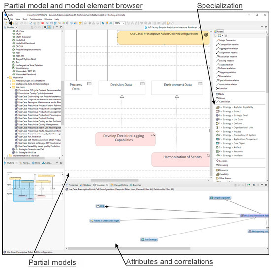 According to Acatech, there is a lack of standardized descriptive models for production systems and decision-support use cases aimed at autonomy and adaptability [59] (p. 57). These models need to be standardized and enable interoperability with other domains and systems engineering approaches [59] (p. 57). EAM provides a range of established metamodels for modeling [60] (p. 79) which are often tailored to the specific needs of a given scenario or organization [65] (p. 111). A widely used metamodel is ArchiMate [64] (p. 14), which is tool-agnostic and supported by multiple modeling environments. In a survey conducted by the BOC Group, 80% of companies reported using an IT tool to support EAM [64] (p. 16). One such tool is Archi (Version 5.7.0 in this journal), which offers a cost-free implementation of ArchiMate [66]. However, domain-specific modeling languages often lack interoperability and a unified architectural vision—frequently separating architectural and business perspectives across languages such as UML and BPMN [60] (p. 37).