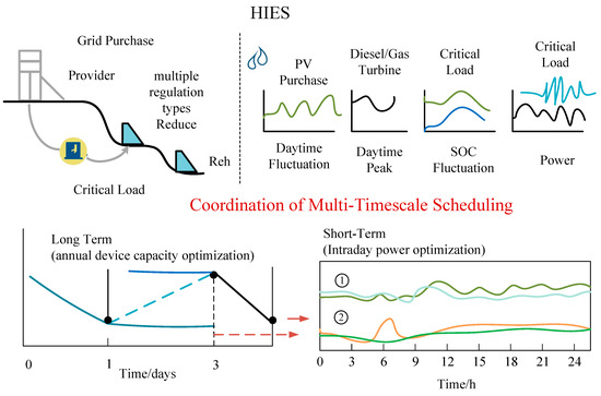 In the scheduling of Hospital Integrated Energy Systems (HIES), the dynamic characteristics of different energy components and load demands often correspond to highly heterogeneous scheduling timescales. To ensure optimal and safe system operation, it is essential to account for the complex interactions across multiple time scales—namely, the coordination and interdependence between long-term planning (e.g., equipment capacity investment, annual maintenance scheduling) and short-term operations (e.g., intra-day charging/discharging, standby unit dispatch). Particularly in wind–solar–storage–diesel hybrid HIES architectures, scheduling spans a wide range of timescales, from long-term activities such as annual or monthly capacity expansion and maintenance strategy formulation, to short-term processes such as photovoltaic/wind power tracking, real-time energy storage dispatch, and rapid diesel generator response within intra-day, hourly, or even minute-level intervals.