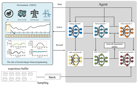 To address the multifaceted challenges in HIES scheduling—including multi-timescale operation, complex medical load connectivity, and system uncertainties—a hybrid strategy that integrates both model-driven and data-driven approaches is proposed. In the proposed framework, Deep Reinforcement Learning (DRL) is employed to optimize long-term scheduling decisions, while Mixed Integer Linear Programming (MILP) is utilized to handle short-term dispatch tasks. This design ensures both computational efficiency and strict adherence to medical operational constraints. The overall architecture of the proposed method is illustrated in Figure 3, highlighting the interaction mechanisms between long-term and short-term scheduling processes.