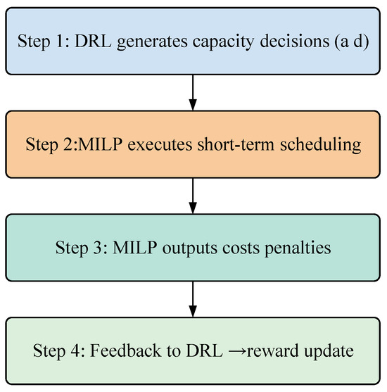 This closed-loop process allows DRL to explore strategic decisions under MILP-enforced feasibility, while MILP benefits from DRL’s adaptive long-term planning.