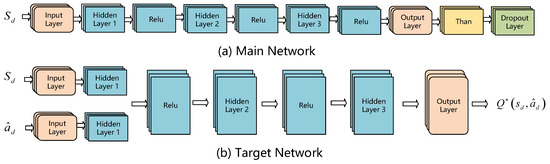 The parameters and denote the weights of the main network and the target network, respectively, and the overall network architecture is illustrated in Figure 4. The smoothing factor (set to in this study) is applied to stabilize the target network updates. The action-value function , â<sub>d</sub>) is updated based on the Bellman equation as follows: