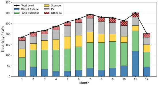Second, photovoltaic (PV) generation demonstrates pronounced seasonal variability. From late spring to early autumn (April–September), PV output increases steadily, peaking in July and August to meet the surge in air-conditioning demand. During this period, PV contributes more than 25% of the total load, significantly improving renewable energy utilization, while reducing both the cost of grid electricity and carbon emissions.