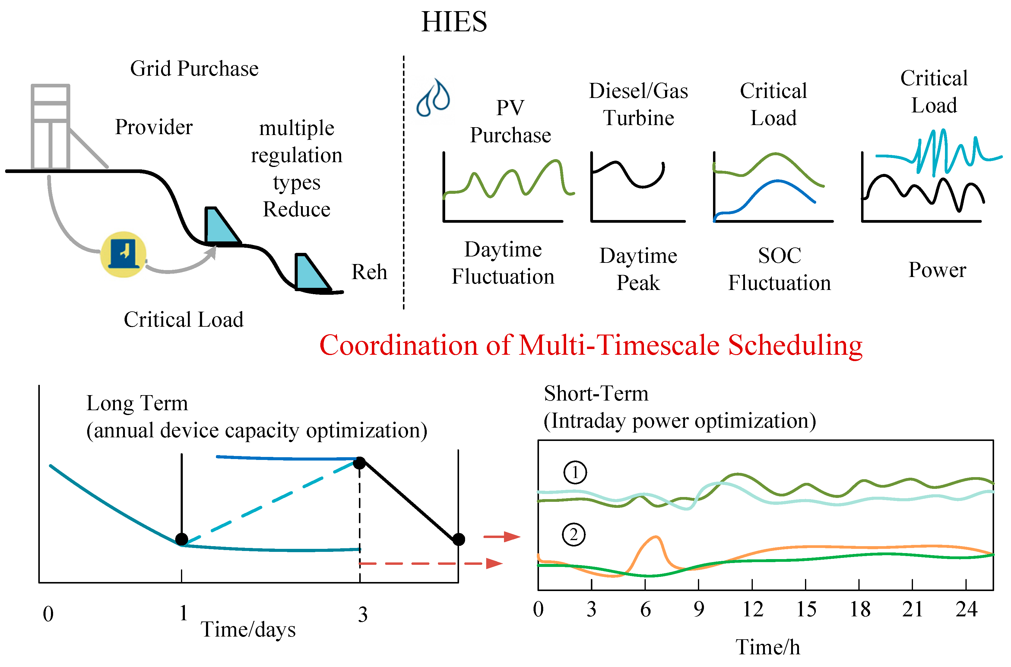 Table 2. The HIES consists of the following core components: a 2000 kW rooftop photovoltaic (PV) system, a 1500 kW diesel generator, and a 3600 kWh hybrid energy storage system (comprising lithium-ion batteries and flywheels). The hospital comprises 800 beds and includes several critical load zones such as the surgical complex, intensive care unit (ICU), emergency department, and general wards. Surgical Complex: Dual-loop power supply with reliability ≥ 99.99%. ICU: Uninterruptible power supply (UPS) with seamless switching (response time ≤ 0.1 s). General Wards: Tiered power supply protection according to priority.