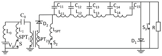 Based on the operational principle of the pulse-forming network (PFN), the discharge initiates from the capacitor closest to the load, which ultimately completes the discharge process. Therefore, the LC unit adjacent to the load predominantly influences the front and trailing edges of the output pulse. Accordingly, the rising and falling edges of the PFN generator’s output pulse in this study can be examined by analyzing the discharge behavior of capacitor C1 in conjunction with the saturated inductance of the saturable pulse transformer (SPT). Utilizing the equivalent circuit model of the LC unit near the load, as depicted in Figure 2, this analysis focuses on the characterization of the front and trailing edges of the PFN generator’s output pulse.