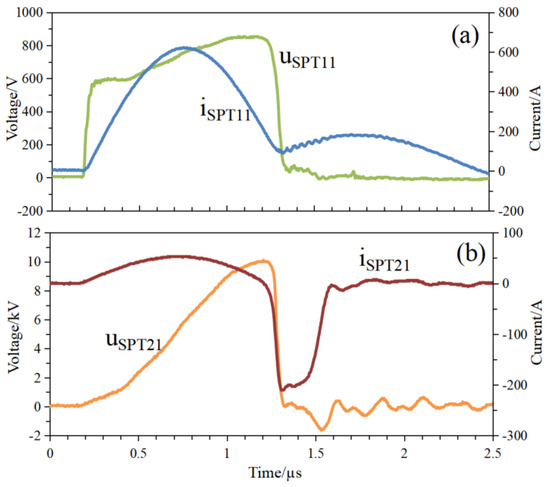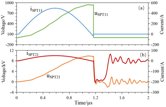 Figure 5a shows the voltage and current waveforms observed on the primary side of the SPT, while Figure 5b depicts the corresponding waveforms on the secondary side. The peak voltage measured on the primary side is 950 V, which is slightly lower than the power supply voltage. This reduction is attributed to the effect of the charging inductance within the primary charging circuit. In contrast, the peak voltage on the secondary side reaches 10 kV. This elevated voltage results from the simulation’s assumption of negligible resistance in the charging circuit, allowing the energy stored in the primary capacitor C0 to be fully transferred to the secondary side. Throughout the energy transfer process from the primary to the secondary side, the current on the secondary side remains approximately proportional to that on the primary side.