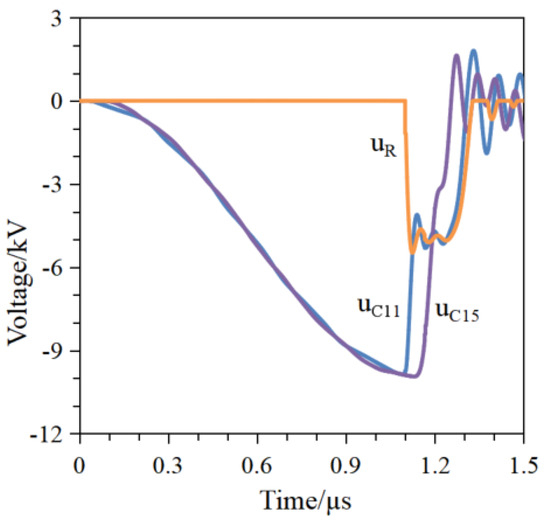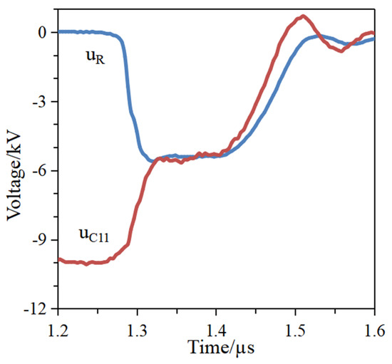 Figure 6 presents the voltage waveforms recorded from a single module across capacitors C11 and C15 and resistor R. As shown, all capacitors within the pulse-forming network (PFN), specifically C11 through C15, are charged synchronously to approximately −10 kV within about 1 μs. Due to resistance matching, the PFN produces nearly square high-voltage pulses at the load following the saturation of the saturable pulse transformer (SPT). The module generates a pulse with a peak voltage of −5.47 kV, a pulse width at half-maximum of 190 ns, and a rise time (10% to 90%) of 20 ns when connected to a 27 Ω matched load. The time required for the voltage to rise from zero to its peak is measured at 30 ns, closely aligning with the theoretically calculated value of 29.37 ns. Furthermore, Figure 6 shows that the voltage rise and fall at the load are closely synchronized with the capacitor nearest the load. This occurs because the PFN discharge initiates from the capacitor adjacent to the load end, with the discharge sequence progressing sequentially from the capacitor farthest from the load toward the load end. Consequently, the front and trailing edges of the PFN output pulse are predominantly influenced by the LC unit closest to the load.