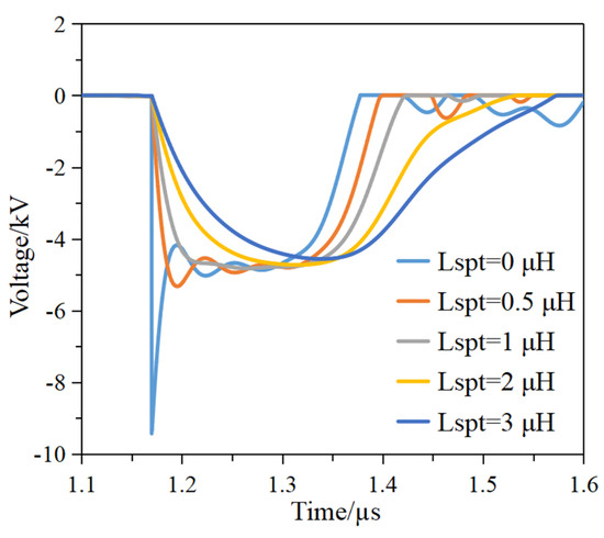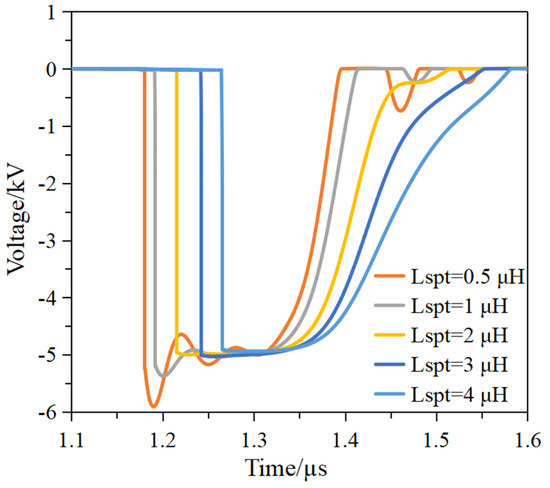 The saturable pulse transformer (SPT) not only amplifies voltage but also functions as a magnetic switch that controls the discharge process. However, increasing the voltage amplification ratio and the number of winding turns results in a higher saturable inductance. Therefore, it is essential to investigate how varying levels of SPT saturation inductance influence the characteristics of the output pulse. Figure 7 illustrates the voltage waveforms across the load for different saturation inductance values (L) of the SPT. Since inductance impedes the current rise—with greater inductance exerting a stronger inhibitory effect—Figure 7 shows that, although load voltage fluctuations and overshoot decrease as the SPT saturation inductance increases, the rise and fall times of the pulse edges correspondingly lengthen. The simulated output voltage pulse edges closely match theoretical predictions, confirming the consistency between simulation and analytical results.