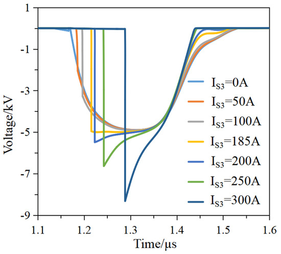Figure 10 illustrates that the reverse current of the sharpening switch S3 reaches 185 A. The output voltage waveform varies with different values of the saturation inductance (LSPT). The effectiveness of the pulse front edge-sharpening technique was evaluated by comparing the output voltage waveforms with and without the sharpening switch, as shown in Figure 7. The analysis yielded the following findings: (1) The pulse front edge-sharpening method effectively mitigates the impact of SPT saturation inductance on the pulse front edge, preventing any increase in the pulse front edge duration as the saturation inductance rises. (2) An increase in the saturation inductance of the SPT corresponds to a reduction in both overshoot and jitter of the output pulse; when the saturation inductance reaches or exceeds 2 μH, the output pulse exhibits negligible jitter and overshoot. (3) Implementation of the pulse front edge-sharpening technique results in a consistent half-height pulse width; however, as the saturation inductance increases, the flat-top width of the pulse progressively narrows at an accelerating rate. (4) The trailing edge of the output pulse lengthens as the saturation inductance of the SPT increases, which aligns with the predictions derived from the trailing edge formula.
