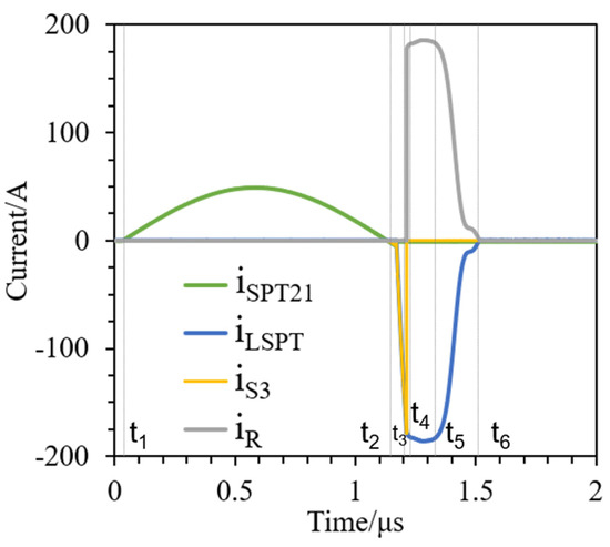 Figure 9 illustrates the current waveforms through the saturated inductor LSPT, the sharpening switch S3, and the load resistor R under optimal sharpening conditions, where the current in the LSPT reaches 185 A. During the charging phase (t1 to t2), the sharpening switch S3 is forward-biased, allowing current to flow sequentially through the SPT and diode D1 to charge the primary energy storage capacitor, while the load resistor R is effectively short-circuited. This configuration prevents the occurrence of pre-pulses across the load. In the sharpening phase (t2 to t3), both switch S2 and the sharpening switch S3 are engaged, directing the entire current passing through the LSPT to flow through the sharpening switch. This action increases the current in the saturated inductor LSPT, while the load resistor R remains short-circuited, thereby avoiding the generation of excitation voltage. During the load current rise phase (t3 to t4), corresponding to the interval from the activation to the complete turn-off of the sharpening switch S3, the current through S3 rapidly diminishes as the load current correspondingly increases. Upon full disconnection of S3, the current through the inductor LSPT flows entirely through the load. In the stable load current output phase (t4 to t5), the PFN delivers a steady current, with all current sequentially passing through the inductor LSPT and the load resistor R. During the load current decline phase (t5 to t6), the current flows sequentially through the SPT and the load resistor R, accompanied by a decrease in the voltage of the main energy storage capacitor, resulting in a reduction in the output current. Under optimal sharpening conditions, specifically, when the inductor current matches the output current, the front edge of the output pulse is predominantly governed by the turn-off speed of the sharpening switch S3.