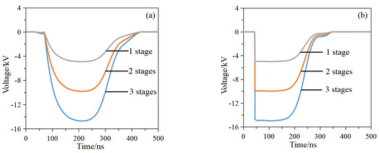 Figure 11a,b depict the output voltage waveforms across the matching load when modules 1, 2, and 3 are charged to 1 kV, with the SPT saturation inductance set at 2 μH, both with and without the pulse front-sharpening technology. The peak output voltage remains consistent regardless of the implementation of the pulse-front sharpening technique. This behavior can be attributed to the fact that the front edge of the output pulse from the PFN generator is primarily governed by the discharge characteristics of the LC units closest to the load. According to the theoretical expressions governing the pulse front and trailing edges, both the front edge fall time and the trailing edge rise time are directly proportional to the LC parameters. Consequently, the application of the pulse front-sharpening technology does not affect the increase in the front and trailing edge durations as the number of stages in the PFN pulse generator increases. Nevertheless, the use of the pulse front-sharpening method significantly reduces the pulse front edge duration (10~90%) from 71 ns to 5 ns. This improvement occurs because, under optimal sharpening conditions, the pulse front edge is predominantly determined by the switching speed of the sharpening switch. Importantly, this pulse generator design enables voltage multiplication through stage superposition without affecting the quality of the output pulse.