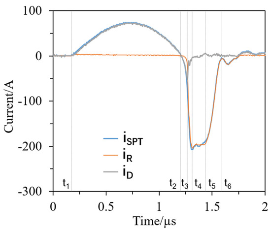 Figure 15 presents the experimentally obtained current waveforms of the SPT, diode D, and load resistor R. The experimental data demonstrate that incorporating a fast recovery diode significantly reduces the time required for the output current to reach its peak value, decreasing from 95 ns (t2 to t4) to 35 ns (t3 to t4). Additionally, the rise time of the pulse front edge shortens from 50 ns to 19 ns (10–90%). A comparative analysis of Figure 9 and Figure 14 reveals that the operational behavior of the pulse generator during experimentation closely aligns with the simulation results. However, the experimentally observed output pulse front edge exhibits a longer duration than predicted by the simulation, attributable to the reverse turn-off speed limitations of the fast recovery diode used in the experiment. Furthermore, the diode’s reverse peak current is slightly lower than the output current, a phenomenon primarily influenced by the diode’s reverse conduction interval and the saturation inductance inherent to the SPT. Notably, during the transition from the diode’s reverse turn-off to its complete cessation of conduction, the current within the saturated SPT continues to increase. Consequently, to prevent overshoot, the diode’s reverse peak current must remain below the output peak current. Moreover, the front edge of the output pulse is governed by the diode’s behavior throughout the entire reverse turn-off phase until full turn-off is achieved.