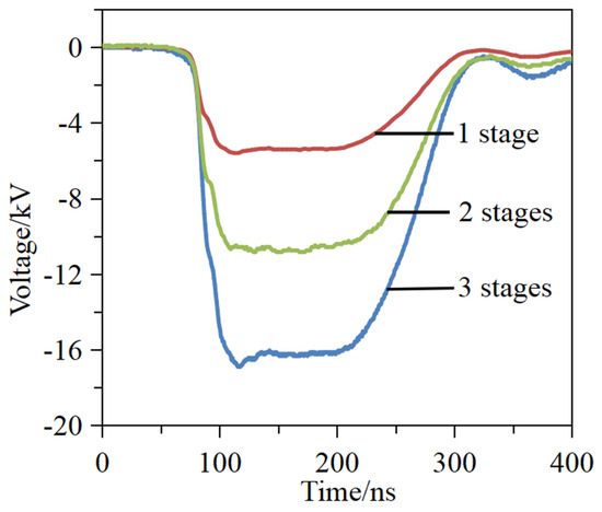 Figure 17 shows the output voltage waveforms of the PFN generators for modules 1, 2, and 3, each connected to loads of 27 Ω, 53 Ω, and 80 Ω, respectively, under a charging voltage of 950 V. The generators for modules 1 through 3 produce pulses with a half-width of 180 ns and peak voltages of −5.67 kV, −11.15 kV, and −16.9 kV, respectively, all exhibiting an identical front-edge duration of 19 ns. These results demonstrate that the pulse generator effectively achieves voltage multiplication through module superposition, without any increase in the rise and fall times of the output pulse as additional modules are combined.