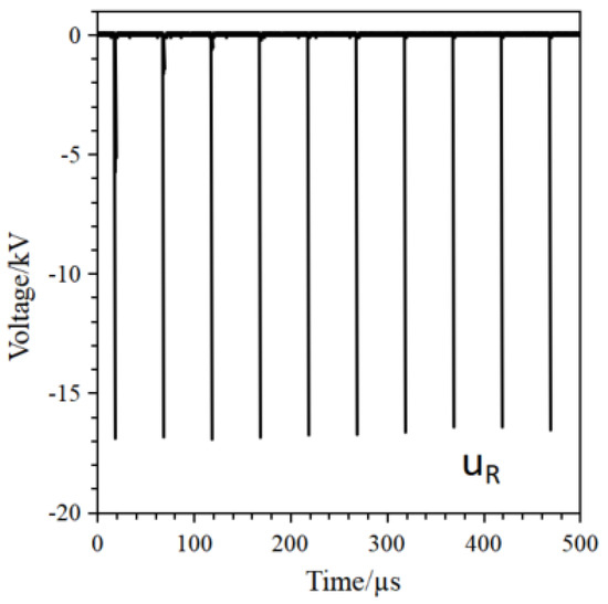 Figure 14 shows the voltage waveforms recorded across capacitor C11 and the resistor R within a single module. Under matched load conditions, when the transformer core saturates, the PFN generator produces nearly square high-voltage pulses across the load. Specifically, one module delivers a peak voltage of −5.67 kV across a 27 Ω matching resistor, with a pulse width of 180 ns at half-maximum and a front edge duration of 19 ns measured between 10% and 90% of the pulse amplitude.