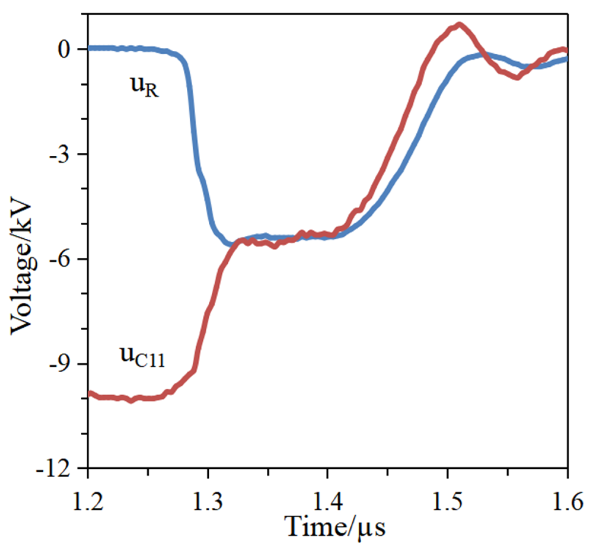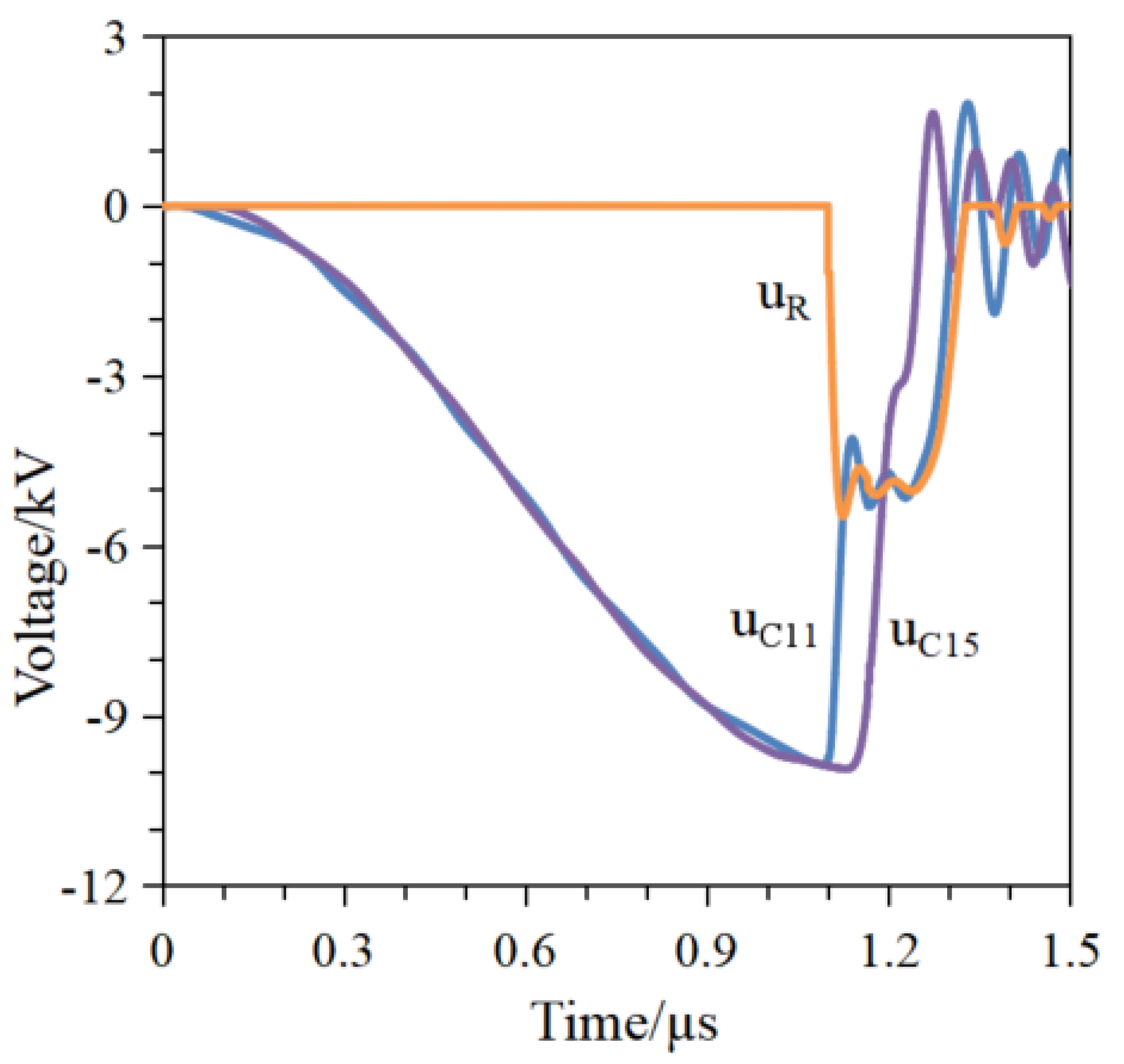 Figure 6 shows that the voltage rise and fall at the load are closely synchronized with the capacitor nearest the load. This occurs because the PFN discharge initiates from the capacitor adjacent to the load end, with the discharge sequence progressing sequentially from the capacitor farthest from the load toward the load end. Consequently, the front and trailing edges of the PFN output pulse are predominantly influenced by the LC unit closest to the load.