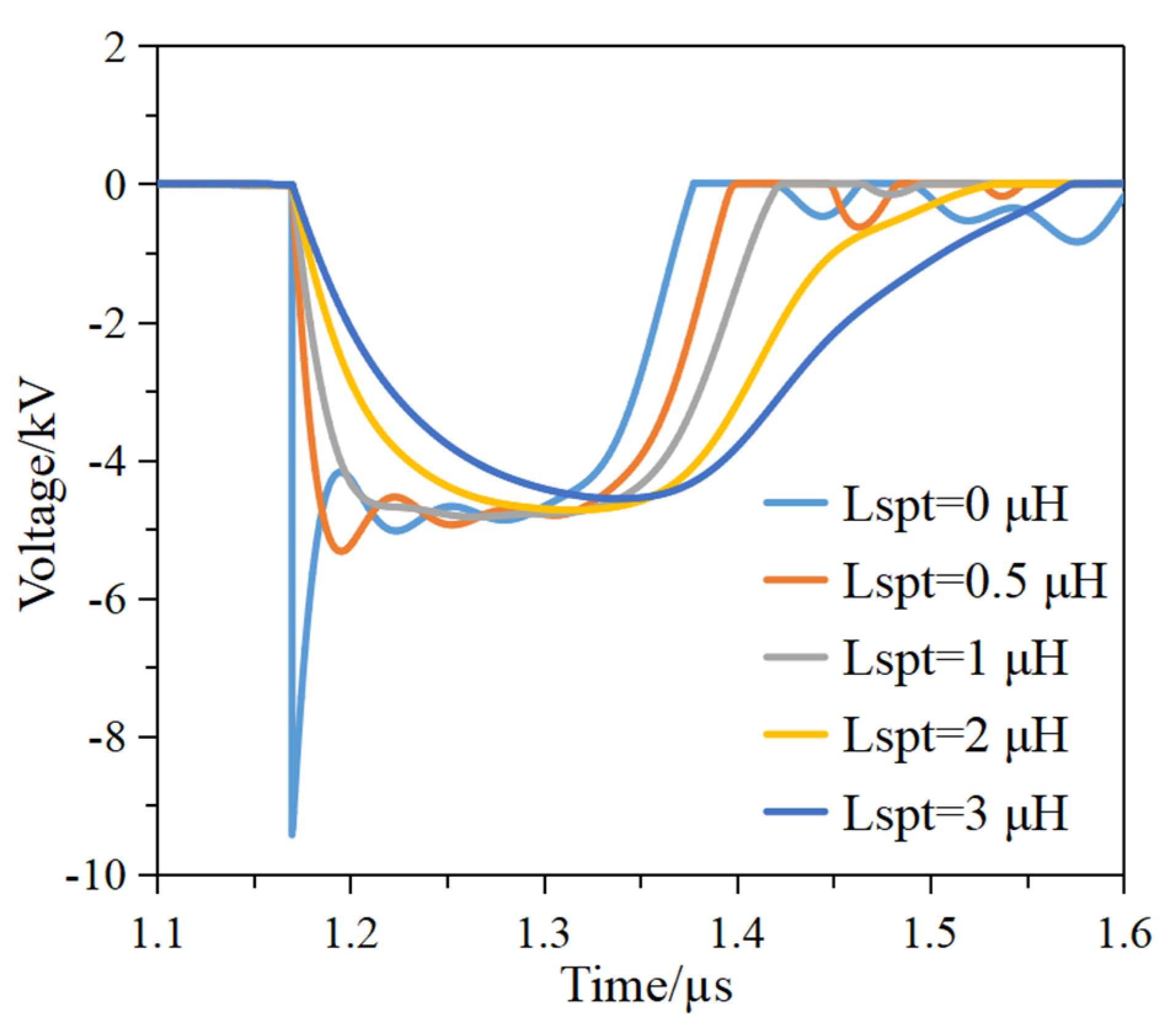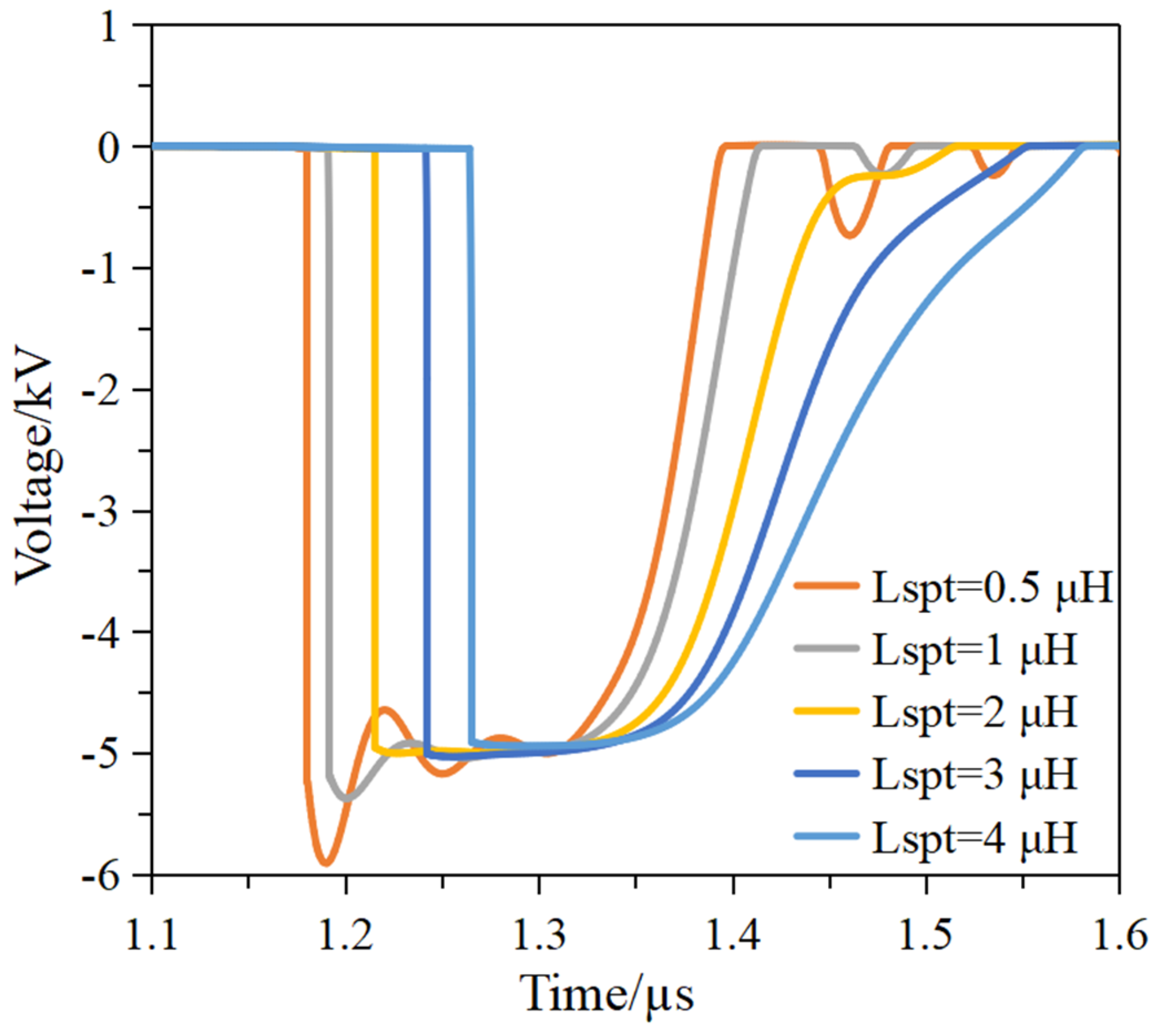 Figure 7. The analysis yielded the following findings: (1) The pulse front edge-sharpening method effectively mitigates the impact of SPT saturation inductance on the pulse front edge, preventing any increase in the pulse front edge duration as the saturation inductance rises. (2) An increase in the saturation inductance of the SPT corresponds to a reduction in both overshoot and jitter of the output pulse; when the saturation inductance reaches or exceeds 2 μH, the output pulse exhibits negligible jitter and overshoot. (3) Implementation of the pulse front edge-sharpening technique results in a consistent half-height pulse width; however, as the saturation inductance increases, the flat-top width of the pulse progressively narrows at an accelerating rate. (4) The trailing edge of the output pulse lengthens as the saturation inductance of the SPT increases, which aligns with the predictions derived from the trailing edge formula.