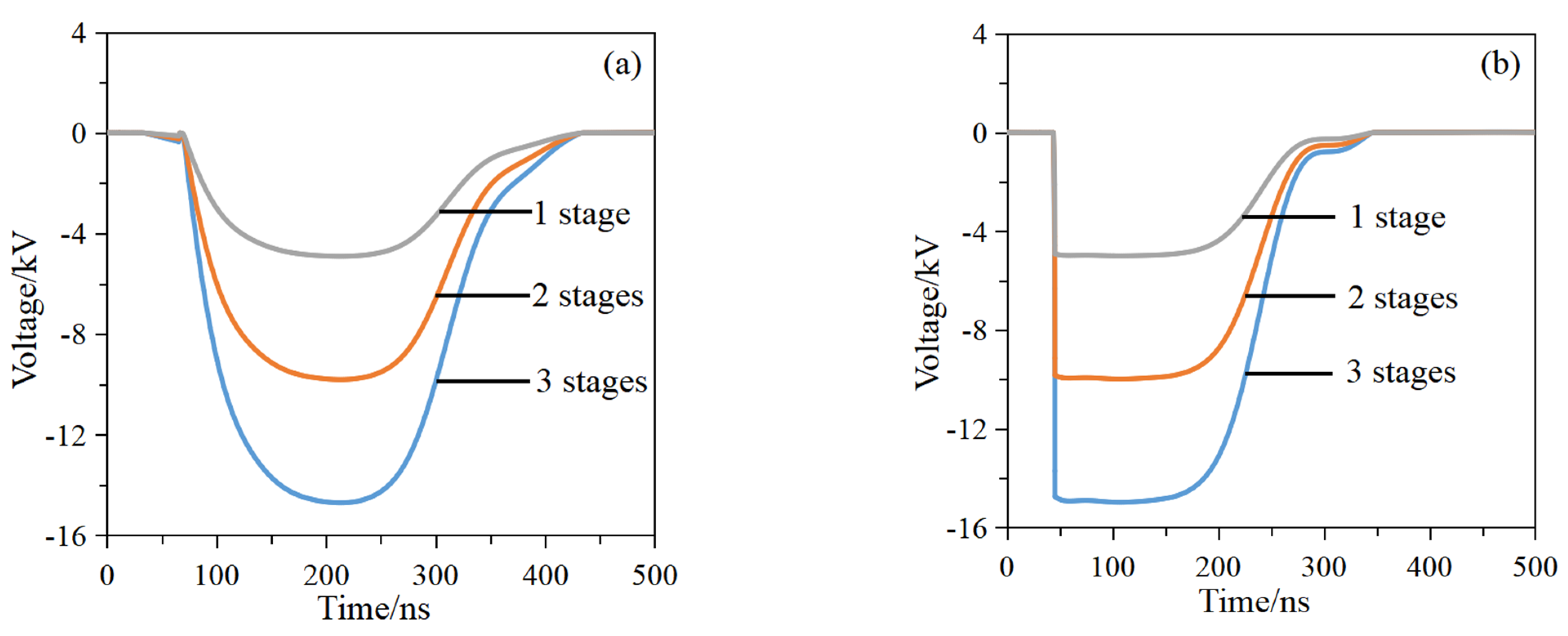 13] investigated a Blumlein PFN pulse generator incorporating an SPT, utilizing a magnetic switch as the principal control element to sharpen the pulse front edge; however, the pulse front edge duration remained above 100 ns at a peak output voltage of 13.2 kV. Similarly, Longyu Zhuang et al. [