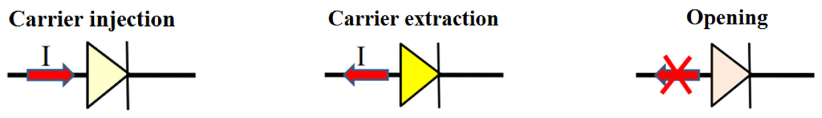 Figure 12 illustrates the operational mechanism of diodes. Initially, carriers are injected into the diode as the forward charging current flows through it. When the voltage polarity across the diode is reversed, a reverse current flows during the extraction of these carriers. The diode turns off once all carriers have been removed. Notably, the turn-off process occurs significantly faster than the carrier extraction phase. Fast recovery diodes, in particular, act as semiconductor open switches characterized by rapid turn-off speeds. Consequently, the fast recovery behavior of these diodes under reverse current conditions can be effectively utilized to sharpen the front edges of pulses.