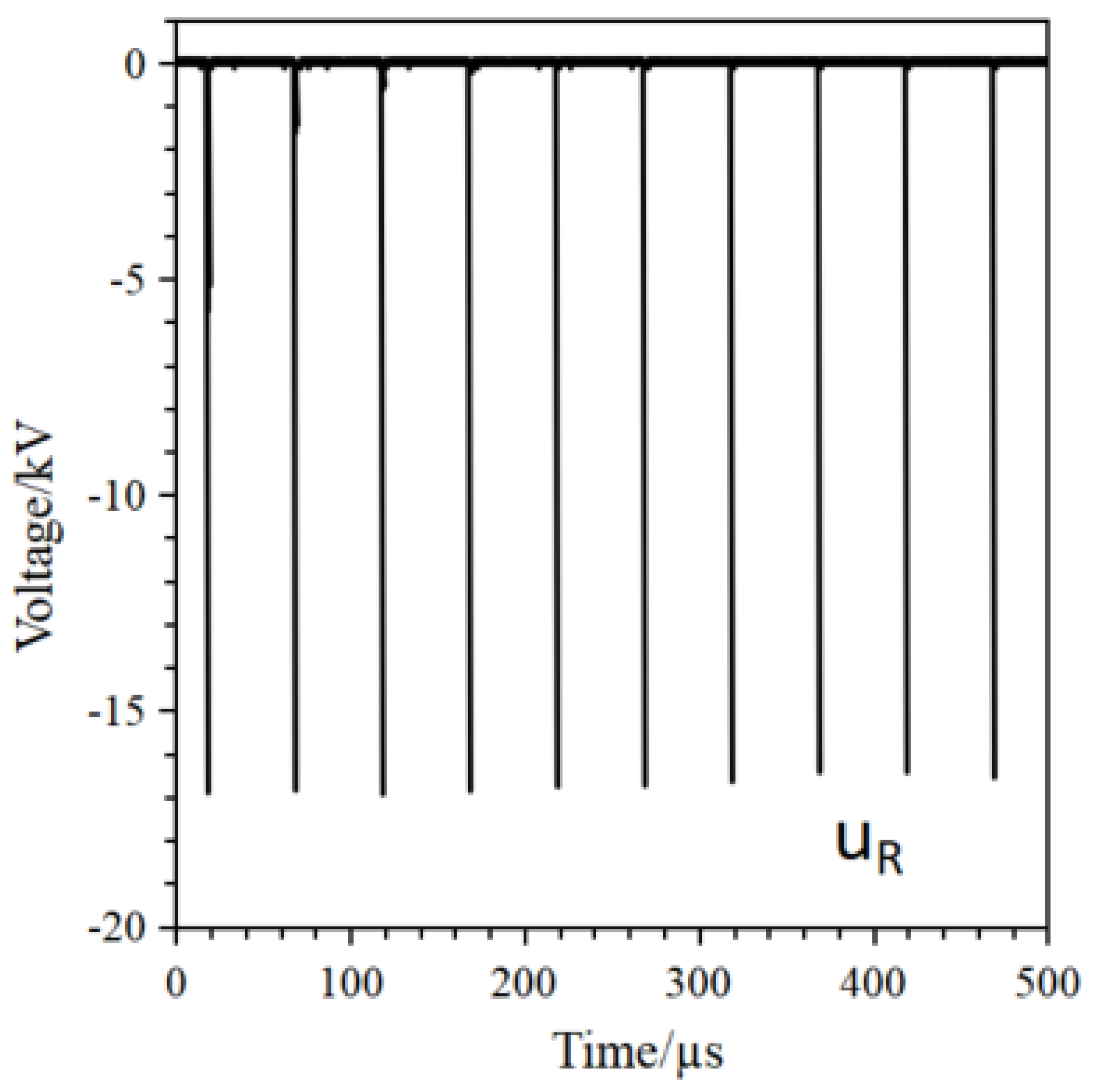 Figure 13a,b depict the voltage and current waveforms on the primary and secondary sides of the SPT, respectively. The peak voltages observed on the primary and secondary sides are 850 V and 10 kV, respectively. These peak voltages are slightly lower than the charging voltage, due to the effects of the switch’s on-resistance and the loop inductance. Additionally, the resistance and inductance within the charging circuit cause a pronounced transient variation in the primary side voltage of the transformer at the onset of discharge. During the energy transfer from the primary to the secondary side, the current on the secondary side remains approximately proportional to that on the primary side.