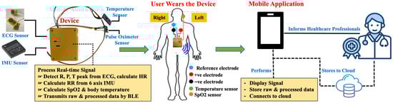 The custom device contains a printed circuit board (PCB) that houses the circuitry for the ECG analog front end (AFE), the IMU, and the two-wire interfaces (TWI) to SpO2, and the temperature sensor. The wearable has three main components: sensors and circuits, a processing unit, and a data transmission unit. Figure 2 provides an overview of key hardware components inside the custom device.