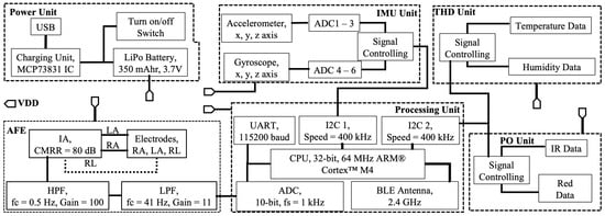 Figure 3e provides the connection architecture for the pulse oximeter (PO) and temperature sensor. Both of the sensors use the I2C instance-2 from the µC unit with 400 kHz. The infrared (IR) and red LED data are captured from the Max30101 sensor (Maxim Integrated, San Jose, CA, USA) to process the SpO2 [61]. The temperature data is captured from the Si702 sensor (Silicon Laboratories Inc., Austin, TX, USA) [62]. The PO and temperature sensor are placed on the ear lobe and chest, respectively. The IR and red LEDs are run at a 3 mA current level.