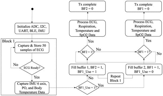 The firmware is designed to process ECG, breathing, SpO2, and temperature data simultaneously. The firmware is programmed into the 32-bit ARM® Cortex™ BLE SoC. Figure 5 presents the overall firmware processing. ECG data are sampled at 1 kHz and processed by the ADC unit. A timer interrupt is used to sample ECG data at every 1 ms. After every 50 ECG samples (corresponding to 50 ms), an event is generated from the ADC to indicate that the ECG buffer is full and ready to store in the mutex buffers. After every 50 ECG samples are stored in the buffer, IMU, PO, and temperature sensors communicate through I2C protocol and provide corresponding data. During each of the 50 ms intervals, 1 sample of each 6-axis IMU, PO, and temperature data are stored in the mutex buffer, which makes the corresponding sampling interval 20 Hz. Block 1 of Figure 5 repeats every 50 ms and stores the data in available mutex buffers. The ECG samples from ADC and all I2C sensor samples are saved in the memory using the direct memory access (DMA) technique for fast and efficient operation.
