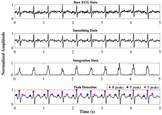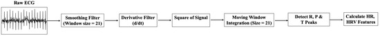 Once the ECG data are collected from the AFE, a timer interrupt is used to sample the raw data at a 1 kHz rate. After every 50 ECG samples, an ADC event is generated, and data are saved in the ECG buffer. The ADC processing uses a direct memory access (DMA) technique so that the data transfer is efficient. The mutex buffers keep storing, until they store 10,000 ECG samples. Once 10 s of data is available, the raw ECG signal is processed on-device to extract ECG morphological features. Figure 6 shows processing steps for the raw ECG signal. The processing starts with a smoothing filter of a 21 window size. The smoothed signal goes through a first-order derivative filter. The signal is squared and further processed with a moving window integrator of 21 windows. From the integrated signal, the R peak indexes are calculated. Consequently, P and T peaks are detected, and corresponding signal-specific features are calculated. The process can return HR, R, P, T amplitudes, and R-R intervals.