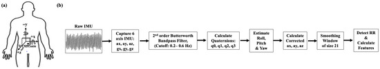 Respiration signal processing: (a) IMU placement, (b) IMU processing.
