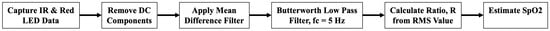 The PO sensor is attached to the ear lobe and provides red and IR LED data. The data are sampled at a 20 Hz rate. Figure 8 refers to the overall PO processing steps. To extract the SpO2, at first, a DC removal filter is applied on the raw LED data, given by the following equations:
