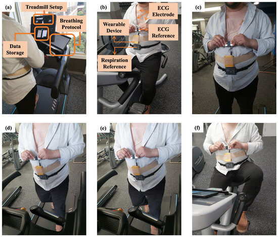 Experimental setup of the protocols and validation for different postures: (a) treadmill setup, (b) sitting, (c) standing, (d) walking, (e) running, and (f) cycling.