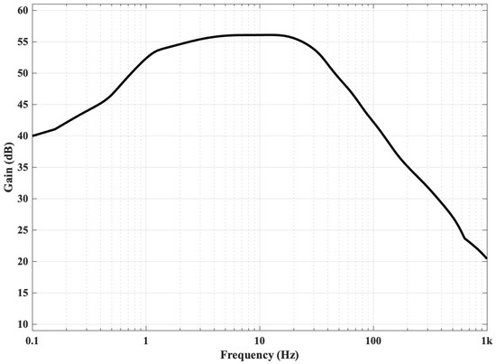The LPF stage adds an additional gain of 11, which makes the overall gain 1100. As the cardiac signal is in the mV range, a reasonable gain factor of 1100 is chosen to better amplify the ECG signal. The 0.5–41 Hz filter range removes baseline drift, muscle artifact, and power line noise, preserving all important ECG waveform components for accurate and stable heart-signal analysis.