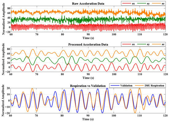 where , , and represent the raw, pitch, and yaw, respectively. The 3-axis accelerometer data are then corrected by subtracting the gravitational component. This provides clean data that is more suitable for respiration monitoring. The following equations provide the definition of the accelerometer axis correction: