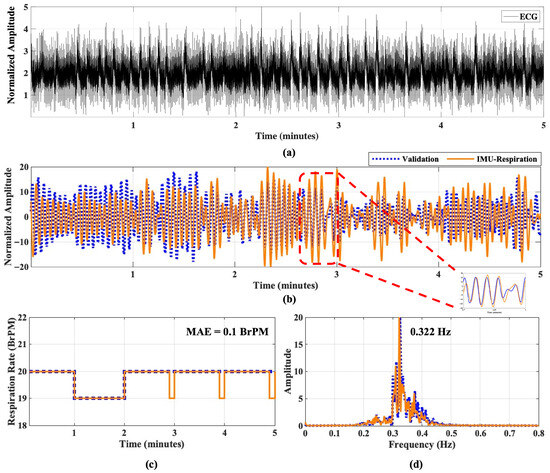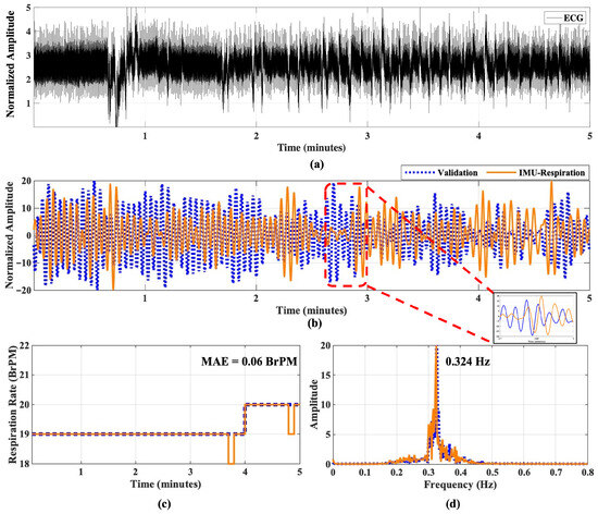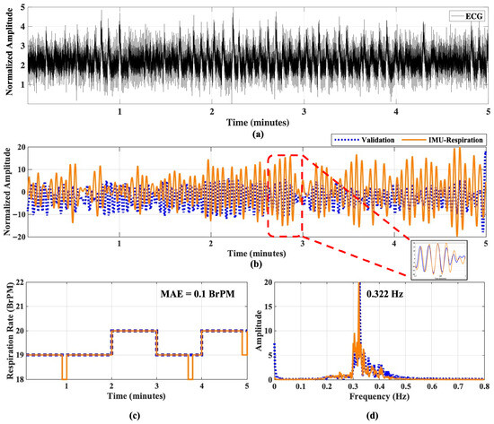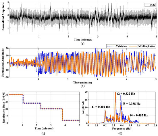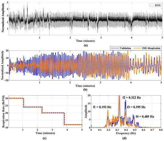 Performance of ECG and IMU-based respiration during cycling compared with validation device for one subject: (a) ECG signal, (b) respiration signal from proposed system, (c) breathing rate (BrPM) variations, and (d) amplitude spectrum of the respiratory signal.