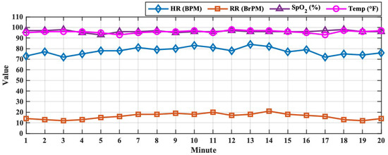 Ambulatory monitoring includes the observation of major physiological signs. We capture and process heart rate (HR), RR, SpO2, and body temperature simultaneously for each subject. Figure 20 presents the simultaneous data processed in real time in an ambulatory setup. The first 5 min are in indoor conditions inside the lab environment that involves sitting and walking. Then, 13 min are spent outdoors with normal walking. During the last 2 min, the participants come back to the starting point. There are also stair-stepping stages during the transition between indoor and outdoor states.