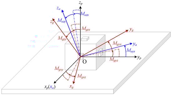 where Maij (i = y, z, j = x, y, i ≠ j) represents the specific force in i-axis sensed from the output by j-axis accelerometer, and Mgij (i = x, y, z, j = x, y, z, i ≠ j) represents the angular velocity in i-axis sensed from the output by j-axis gyroscope.